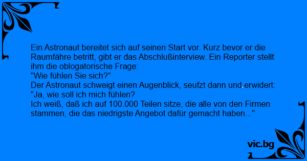 Ein Astronaut bereitet sich auf seinen Start vor. Kurz bevor er die Raumfähre betritt, gibt er das Abschlußinterview. Ein Reporter stellt ihm die oblogatorische Frage: