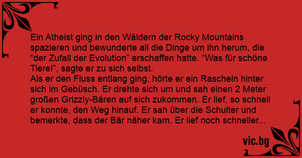 Ein Atheist ging in den Wäldern der Rocky Mountains spazieren und bewunderte all die Dinge um ihn herum, die “der Zufall der Evolution” erschaffen hatte. “Was für schöne Tiere!”, sagte er zu sich selbst.