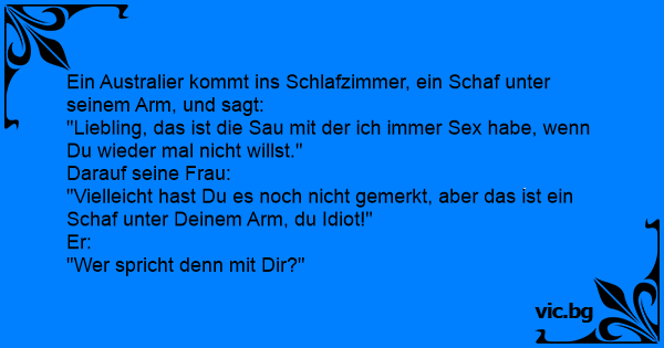 Ein Australier kommt ins Schlafzimmer, ein Schaf unter seinem Arm, und sagt: