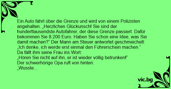 Die Polizei stoppt auf einer Brücke ein Auto. Der Polizei sagt zum Mann am Steuer: ,Sie sind das millionste Auto, das über diese Brücke fährt und gewinnen 100.000 €. Was machen Sie mit dem Geld?"...