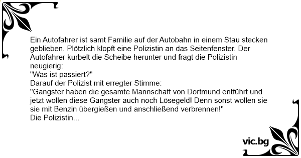 Ein Autofahrer ist samt Familie auf der Autobahn in einem Stau stecken geblieben. Plötzlich klopft eine Polizistin an das Seitenfenster. Der Autofahrer kurbelt die Scheibe herunter und fragt die Polizistin neugierig: