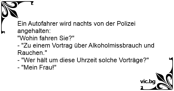 Полицаец застанува пијан маж и го прашува: - Каде сте тргнале толку доцна навечер? - На предавање. - Е како да не. Кој држи предавања во ова време?! - Жена ми!!