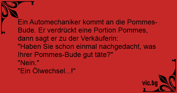 Ein Automechaniker kommt an die Pommes-Bude. Er verdrückt eine Portion Pommes, dann sagt er zu der Verkäuferin:
