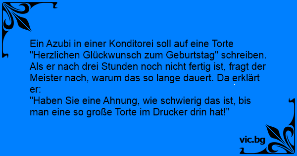 Ein Azubi in einer Konditorei soll auf eine Torte "Herzlichen Glückwunsch zum Geburtstag" schreiben. Als er nach drei Stunden noch niсhт fertig ist, fragt der Meister nach, warum das so lange dauert. Da erklärt er: