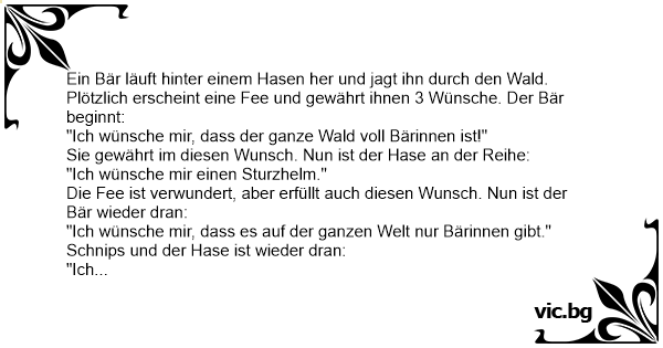 Ein Bär läuft hinter einem Hasen her und jagt ihn durch den Wald. Plötzlich erscheint eine Fee und gewährt ihnen 3 Wünsche. Der Bär beginnt: