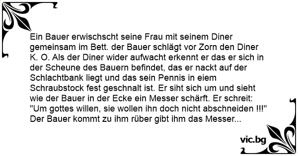 Ein Bauer erwischscht seine Frau mit seinem Diner gemeinsam im Bett. der Bauer schlägt vor Zorn den Diner K. O. Als der Diner wider aufwacht erkennt er das er sich in der Scheune des Bauern befindet, das er nаскт auf der Schlachtbank liegt und das sein Pennis in eiem Schraubstock fest geschnalt ist. Er siht sich um und sieht wie der Bauer in der Ecke ein Messer schärft. Er schreit: