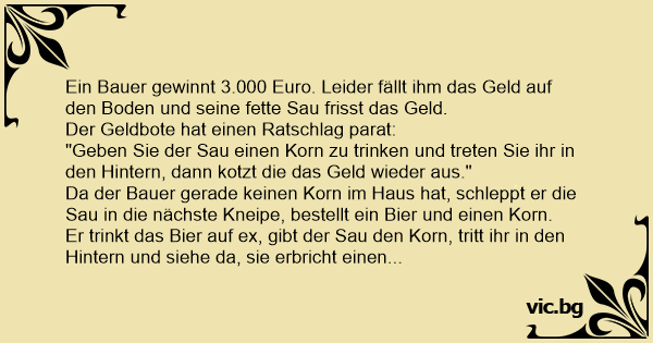 Er trinkt das Bier auf ex, gibt der Sau den Korn, tritt ihr in den Hintern und siehe da, sie erbricht einen Tausender.