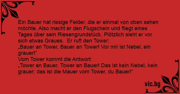 Ein Bauer hat riesige Felder, die er einmal von oben sehen möchte. Also macht er den Flugschein und fliegt eines Tages über sein Riesengrundstück. Plötzlich sieht er vor sich etwas Graues. Er ruft den Tower: