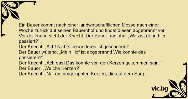 Ein Bauer kommt nach einer landwirtschaftlichen Messe nach einer Woche zurück auf seinen Bauernhof und findet diesen abgebrannt vor. Vor der Ruine steht der Knecht. Der Bauer fragt ihn: „Was ist denn hier passiert?“.