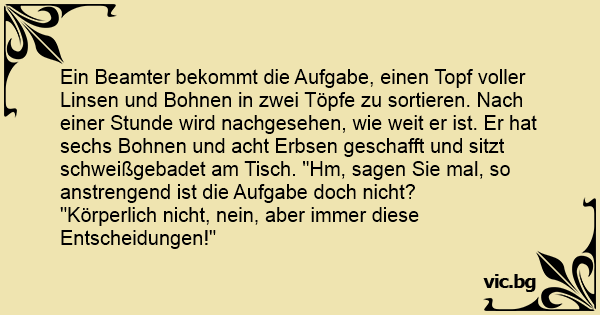 Ein Beamter bekommt die Aufgabe, einen Topf voller Linsen und Bohnen in zwei Töpfe zu sortieren. Nach einer Stunde wird nachgesehen, wie weit er ist. Er hat sechs Bohnen und acht Erbsen geschafft und sitzt schweißgebadet am Tisch. "Hm, sagen Sie mal, so anstrengend ist die Aufgabe doch niсhт?
