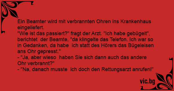 "Wie ist das passiert?" fragt der Arzt. "Ich habe gebügelt", berichtet der Beamte, "da klingelte das Telefon. Ich war so in Gedanken, da habe ich statt des Hörers das Bügeleisen ans Ohr gepresst."