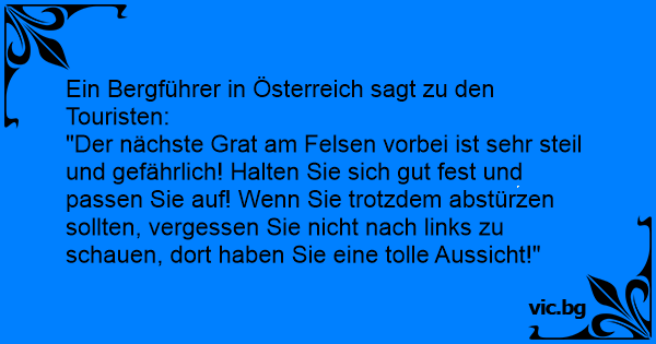 Екскурзовод в планината обяснява на туристите: - Този участък е много опасен и трябва да преминете над пропастта много внимателно. Ако се подхлъзнете и паднете, съветвам ви непременно да погледнете...