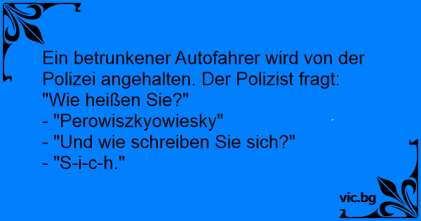 Ein betrunkener Autofahrer wird von der Polizei angehalten. Der Polizist fragt: