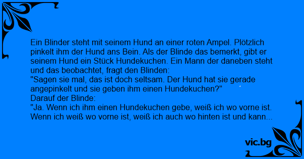 Ein Blinder steht mit seinem Hund an einer roten Ampel. Plötzlich pinkelt ihm der Hund ans Bein. Als der Blinde das bemerkt, gibt er seinem Hund ein Stück Hundekuchen. Ein Mann der daneben steht und das beobachtet, fragt den Blinden: