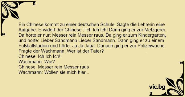 Ein Chinese kommt zu einer deutschen Schule. Sagte die Lehrerin eine Aufgabe. Erwidert der Chinese : Ich Ich Ich! Dann ging er zur Metzgerei. Da hörte er nur: Messer rein Messer raus. Da ging er zum Kindergarten, und hörte: Lieber Sandmann Lieber Sandmann. Dann ging er zu einem Fußballstadion und hörte: Ja Ja Jaaa. Danach ging er zur Polizeiwache.