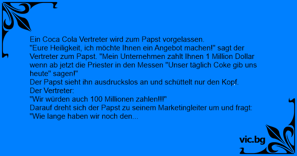 "Eure Heiligkeit, ich möchte Ihnen ein Angebot machen!" sagt der Vertreter zum Papst. "Mein Unternehmen zahlt Ihnen 1 Million Dollar wenn ab jetzt die Priester in den Messen "Unser täglich Coke gib uns heute" sagen!"