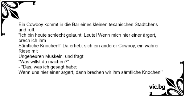 Ein Cowboy kommt in die Bar eines kleinen texanischen Städtchens und ruft: