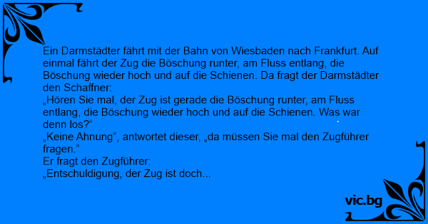 Ein Darmstädter fährt mit der Bahn von Wiesbaden nach Frankfurt. Auf einmal fährt der Zug die Böschung runter, am Fluss entlang, die Böschung wieder hoch und auf die Schienen. Da fragt der Darmstädter den Schaffner: