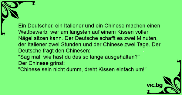 Ein Deutscher, ein Italiener und ein Chinese machen einen Wettbewerb, wer am längsten auf einem Kissen voller Nägel sitzen kann. Der Deutsche schafft es zwei Minuten, der Italiener zwei Stunden und der Chinese zwei Tage. Der Deutsche fragt den Chinesen: