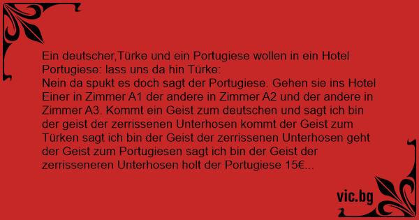 Nein da spukt es doch sagt der Portugiese. Gehen sie ins Hotel Einer in Zimmer A1 der andere in Zimmer A2 und der andere in Zimmer A3. Kommt ein Geist zum deutschen und sagt ich bin der geist der zerrissenen Unterhosen kommt der Geist zum Türken sagt ich bin der Geist der zerrissenen Unterhosen geht der Geist zum Portugiesen sagt ich bin der Geist der zerrisseneren Unterhosen holt der Portugiese 15€ raus und sagt bitte kauf dir neue