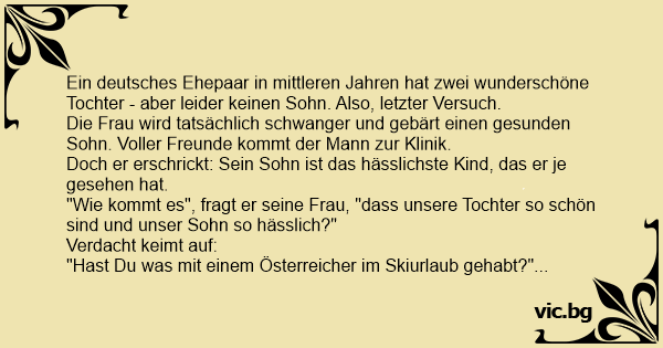 "Wie kommt es", fragt er seine Frau, "dass unsere Tochter so schön sind und unser Sohn so hässlich?"