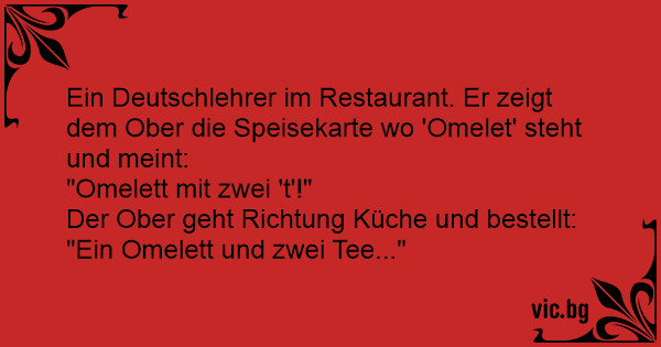 Ein Deutschlehrer im Restaurant. Er zeigt dem Ober die Speisekarte wo 'Omelet' steht und meint: