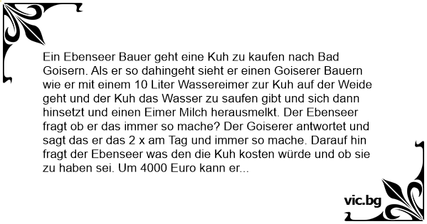 Gesagt getan und der ganze Ort hat sich versammelt mit sammt der Musikkapelle und die Kuh wurde in den See geführt und einer melkte wie wild am Euter bis die Milch aus war. He, schrie der Bürgermeister ihr müßt den Kopf wieder in das Wasser tauchen die Kuh gibt keine Milch mehr! Worauf die Kuh den Sсhwаnz hob und geschißen hat. Der Bürgermeister schrie darauf hin, den Kopf niсhт zu weit ins Wasser hineinzuhalten da die Kuh ja schon den Dreck ansaugt!