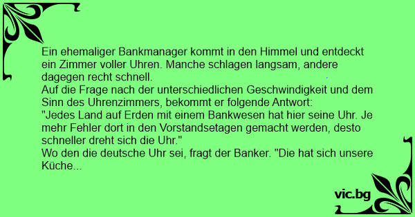 Ein ehemaliger Bankmanager kommt in den Himmel und entdeckt ein Zimmer voller Uhren. Manche schlagen langsam, andere dagegen recht schnell.