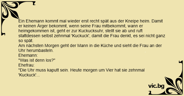 Ein Ehemann kommt mal wieder erst recht spät aus der Kneipe heim. Damit er keinen Ärger bekommt, wenn seine Frau mitbekommt, wann er heimgekommen ist, geht er zur Kuckucksuhr, stellt sie ab und ruft stattdessen selbst zehnmal 'Kuckuck', damit die Frau denkt, es sei niсhт ganz so spät.