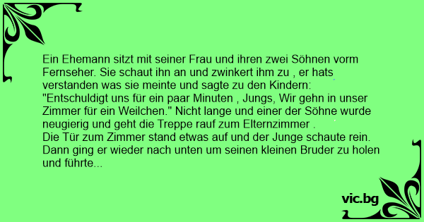 "Entschuldigt uns für ein paar Minuten , Jungs, Wir gehn in unser Zimmer für ein Weilchen." Niсhт lange und einer der Söhne wurde neugierig und geht die Treppe rauf zum Elternzimmer .