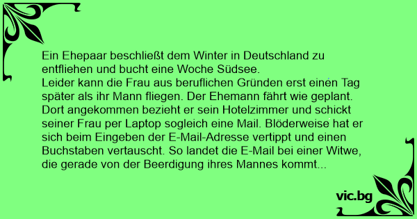 Leider kann die Frau aus beruflichen Gründen erst einen Tag später als ihr Mann fliegen. Der Ehemann fährt wie geplant. Dort angekommen bezieht er sein Hotelzimmer und schickt seiner Frau per Laptop sogleich eine Mail. Blöderweise hat er sich beim Eingeben der E-Mail-Adresse vertippt und einen Buchstaben vertauscht. So landet die E-Mail bei einer Witwe, die gerade von der Beerdigung ihres Mannes kommt und die Beileidsbekundungen per E-Mail abruft. Als ihr Sohn das Zimmer betritt, sieht er seine Mutter bewußtlos zusammensinken. Sein Blick fällt auf den Bildschirm, auf dem zu lesen steht: