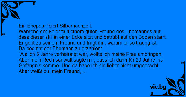 Während der Feier fällt einem guten Freund des Ehemannes auf, dass dieser still in einer Ecke sitzt und betrübt auf den Boden starrt. Er geht zu seinem Freund und fragt ihn, warum er so traurig ist.