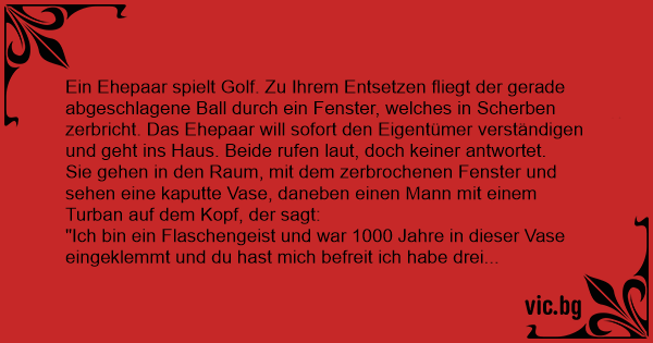 Das Ehepaar willigt nach kurzer Beratung ein. Wenig später sind die Frau und der Geist ordentlich am Рiмреrn, während der Ehemann wieder Golf spielt. "Wie alt ist dein Ehemann?", fragt der Geist. "31", antwortet die Frau. "Und dann glaubt er noch an Flaschengeister?"
