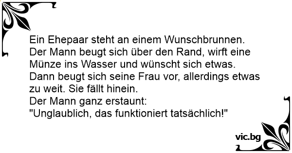 Een echtpaar staat bij een wensput. De man buigt zich voorover, werpt een euro in het water en doet een wens. Dan buigt de vrouw zich voorover, maar iets te ver en ze valt in de put. De man kijkt...
