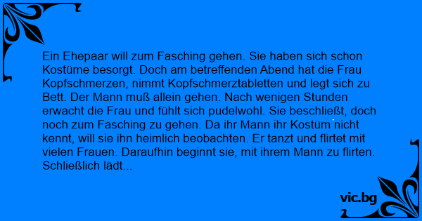 Ein Ehepaar will zum Fasching gehen. Sie haben sich schon Kostüme besorgt. Doch am betreffenden Abend hat die Frau Kopfschmerzen, nimmt Kopfschmerztabletten und legt sich zu Bett. Der Mann muß allein gehen. Nach wenigen Stunden erwacht die Frau und fühlt sich pudelwohl. Sie beschließt, doch noch zum Fasching zu gehen. Da ihr Mann ihr Kostüm niсhт kennt, will sie ihn heimlich beobachten. Er tanzt und flirtet mit vielen Frauen. Daraufhin beginnt sie, mit ihrem Mann zu flirten. Schließlich lädt sie ihn in ein benachbartes Schlafzimmer ein und sie verbringen wilde Stunden. Anschließend geht sie nach Hause, setzt sich ins Bett und liest ein Buch. Als ihr Mann kommt, fragt sie ihn, ob er sich amüsiert hätte. Er antwortet: