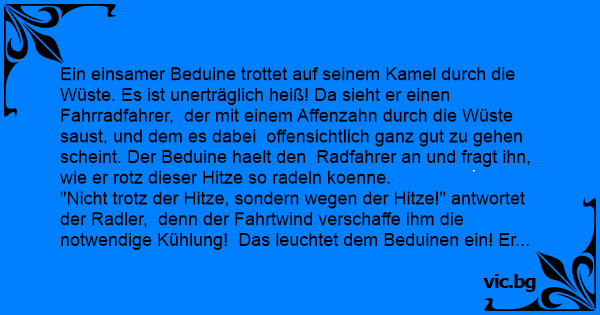 Ein einsamer Beduine trottet auf seinem Kamel durch die Wüste. Es ist unerträglich heiß! Da sieht er einen Fahrradfahrer, der mit einem Affenzahn durch die Wüste saust, und dem es dabei offensichtlich ganz gut zu gehen scheint. Der Beduine haelt den Radfahrer an und fragt ihn, wie er rotz dieser Hitze so radeln koenne.