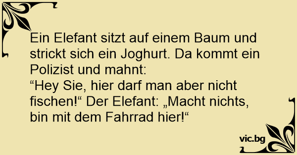 Ein Elefant sitzt auf einem Baum und strickt sich ein Joghurt. Da kommt ein Polizist und mahnt: