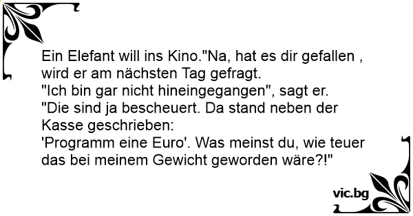 Ein Elefant will ins Kino."Na, hat es dir gefallen , wird er am nächsten Tag gefragt.