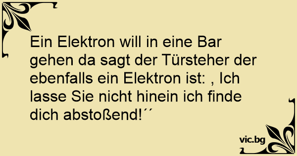 Ein Elektron will in eine Bar gehen da sagt der Türsteher der ebenfalls ein Elektron ist: , Ich lasse Sie niсhт hinein ich finde dich abstoßend!´´