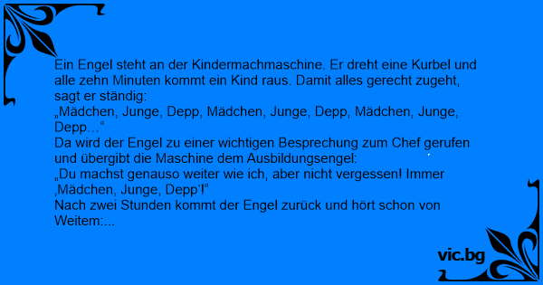 Ein Engel steht an der Kindermachmaschine. Er dreht eine Kurbel und alle zehn Minuten kommt ein Kind raus. Damit alles gerecht zugeht, sagt er ständig: