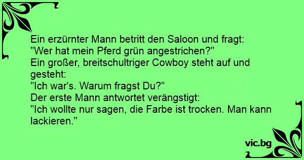 Μια μέρα, ένας καουμπόη, μπαίνει νευριασμένος σ` ένα σαλούν και φωνάζει: - "Ποιος έβαψε το άλογό μου πράσινο;" Δεν παίρνει απάντηση, και ξαναρωτάει: - "Ποιος έβαψε το άλογό μου πράσινο;" Σηκώνεται...