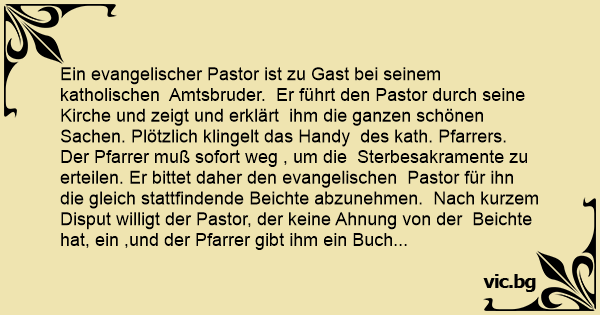 Ein evangelischer Pastor ist zu Gast bei seinem katholischen Amtsbruder. Er führt den Pastor durch seine Kirche und zeigt und erklärt ihm die ganzen schönen Sachen. Plötzlich klingelt das Handy des kath. Pfarrers. Der Pfarrer muß sofort weg , um die Sterbesakramente zu erteilen. Er bittet daher den evangelischen Pastor für ihn die gleich stattfindende Beichte abzunehmen. Nach kurzem Disput willigt der Pastor, der keine Ahnung von der Beichte hat, ein ,und der Pfarrer gibt ihm ein Buch mit der Auflistung der Sünden und der entsprechenden Sühneleistungen.