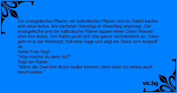 Ein evangelischer Pfarrer, ein katholischer Pfarrer und ein Rabbi kaufen sich neue Autos. Am nächsten Samstag ist Waschtag angesagt. Der evangelische und der katholische Pfarrer kippen einen Eimer Wasser über ihre Autos. Der Rabbi guckt sich das ganze nachdenklich an. Dann geht er in die Werkstatt, holt eine Säge und sägt ein Stück vom Auspuff ab.