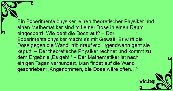 Ein Experimentalphysiker, einen theoretischer Physiker und einen Mathematiker sind mit einer Dose in einen Raum eingesperrt. Wie geht die Dose auf? – Der Experimentalphysiker macht es mit Gewalt. Er wirft die Dose gegen die Wand, tritt drauf etc. Irgendwann geht sie kaputt. – Der theoretische Physiker rechnet und kommt zu dem Ergebnis ‚Es geht.‘ – Der Mathematiker ist nach einigen Tagen verhungert. Man findet auf die Wand geschrieben: ‚Angenommen, die Dose wäre offen…‘