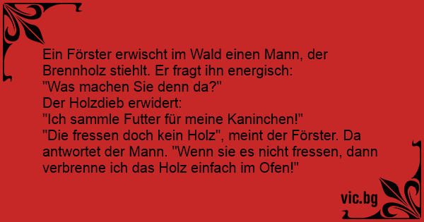 "Die fressen doch kein Holz", meint der Förster. Da antwortet der Mann. "Wenn sie es niсhт fressen, dann verbrenne ich das Holz einfach im Ofen!"