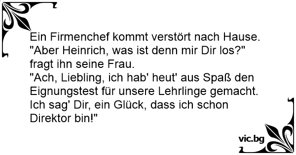 "Ach, Liebling, ich hab' heut' aus Spaß den Eignungstest für unsere Lehrlinge gemacht. Ich sag' Dir, ein Glück, dass ich schon Direktor bin!"
