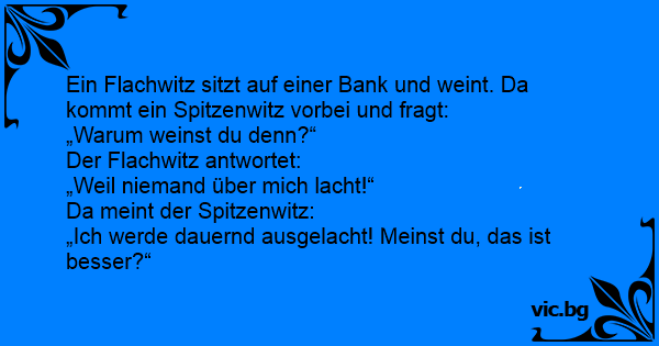 Ein Flachwitz sitzt auf einer Bank und weint. Da kommt ein Spitzenwitz vorbei und fragt: