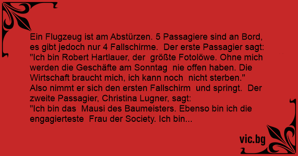 In einem Flugzeug sitzen, neben dem Piloten, George Bush, Helmut Kohl, der Papst und ein Student. Plötzlich gerät das Flugzeug in heftige Turbulenzen und droht abzustürzen. Von den insgesamt 4...