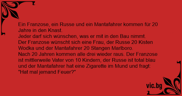 Ein Franzose, ein Russe und ein Mantafahrer kommen für 20 Jahre in den Knast.