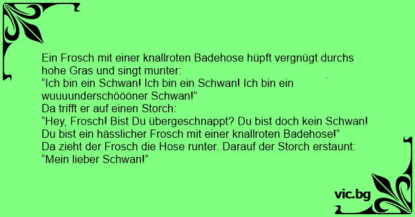 “Hey, Frosch! Bist Du übergeschnappt? Du bist doch kein Schwan! Du bist ein hässlicher Frosch mit einer knallroten Badehose!”